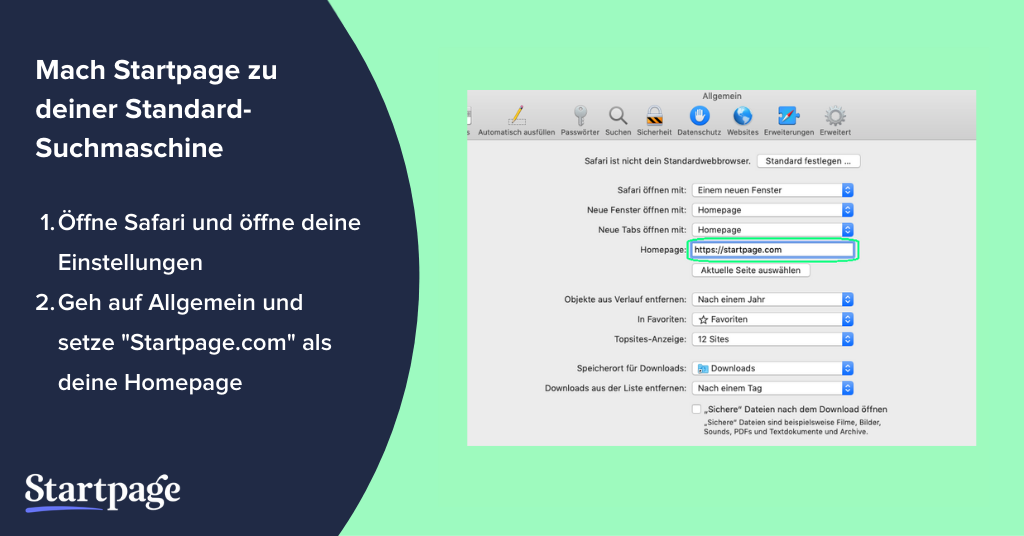 Mach Startpage zu deiner Standard-Suchmaschine: Safari > Einstellungen > Allgemein > Felder „Neue Fenster/neuen Tab öffnen mit“ auf Homepage setzen > https://startpage.com im Feld “Homepage” eingeben