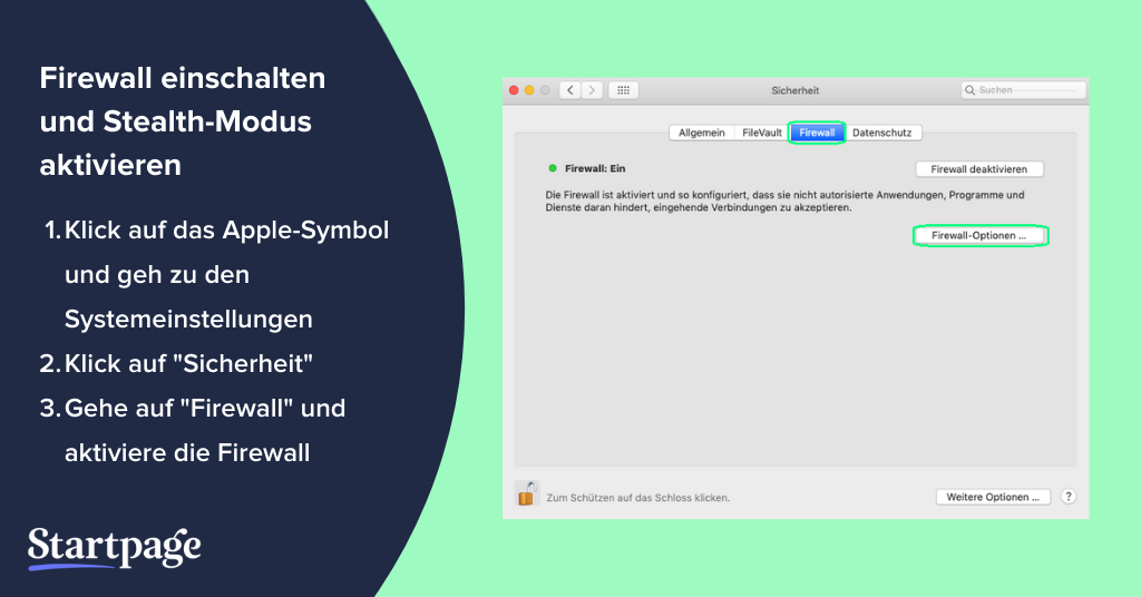 Firewall einschalten und Stealth-Modus aktivieren: Apple Symbol > System Einstellungen > Einstellungen > Sicherheit > Firewall aktivieren – und Firewall-Optionen