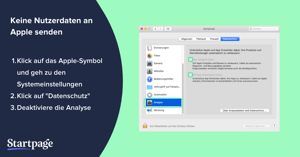 Keine Nutzerdaten an Apple senden: Apple Icon > System Einstellungen > Einstellungen > Sicherheit > Datenschutz > Analyse