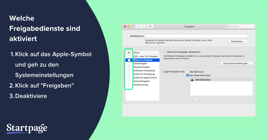 Freigabedienste wie Bildschirmfreigabe, Dateifreigabe und Fernanmeldung sind mit Sicherheits- und Datenschutzrisiken verbunden. Überprüfe deine Freigabeeinstellungen und deaktiviere alle, die für deine Arbeit nicht notwendig sind.