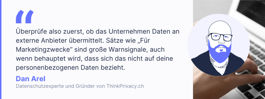 Überprüfe also zuerst, ob das Unternehmen Daten an externe Anbieter übermittelt. Sätze wie „Für Marketingzwecke“ sind große Warnsignale, auch wenn behauptet wird, dass sich das nicht auf deine personenbezogenen Daten bezieht. Es handelt sich hierbei nämlich um eine Grauzone, der du Beachtung schenken solltest. Ich werde in Punkt 2 noch weiter auf dieses Thema eingehen.