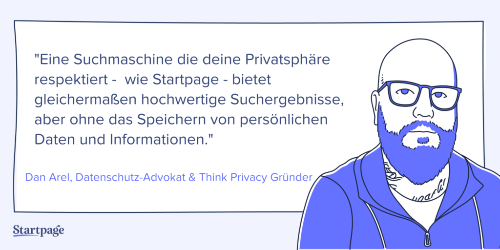 Eine Suchmaschine die deine Privatsphäre respektiert – wie z.B. Startpage – bietet gleichermaßen hochwertige Suchergebnisse, aber ohne das Speichern von persönlichen Daten und Informationen, die unrechtmäßig gegen dich verwendet werden können. Startpage hat keine Ahnung, wer du bist und wonach du suchst.