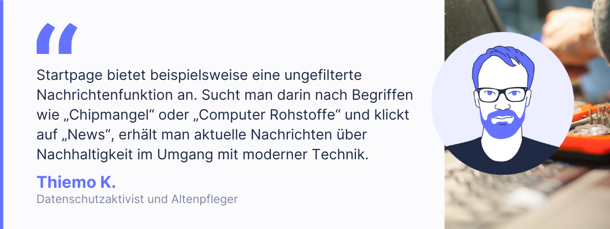 Einige Menschen sind sich dessen bewusst, dass Nachhaltigkeit auch in der Herstellung und Verwendung von elektronischen Geräten eine Rolle spielen sollte. Wer sich darüber noch keine Gedanken gemacht hat, kann anfangen, zu recherchieren. Startpage bietet beispielsweise eine ungefilterte Nachrichtenfunktion an. Sucht man darin nach Begriffen wie „Chipmangel“ oder „Computer Rohstoffe“ und klickt auf „News“, erhält man aktuelle Nachrichten über Nachhaltigkeit im Umgang mit moderner Technik. Dank Angeboten wie der Newsfunktion von Startpage können wir uns ebenso über die Menschenrechtslage und Arbeitsbedingungen in Goldminen und den Abbaugebieten von Lithium, Kobalt & Co. informieren, die bei unseren smarten Geräten zum Einsatz kommen.