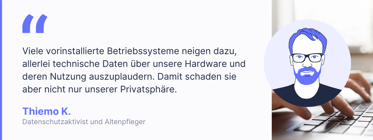Multimediale Werbung marktführender Hard- und Softwarekonzerne suggeriert uns, es müsse immer das Neuste vom Neusten sein. Viele vorinstallierte Betriebssysteme neigen dazu, allerlei technische Daten über unsere Hardware und deren Nutzung auszuplaudern. Damit schaden sie aber nicht nur unserer Privatsphäre: Oft laufen diese Betriebssysteme nur auf brandaktueller Hardware, was uns in die Bedrängnis bringt, den Systemanforderungen hinterher zu laufen und ständig wieder neue Hardware anzuschaffen.