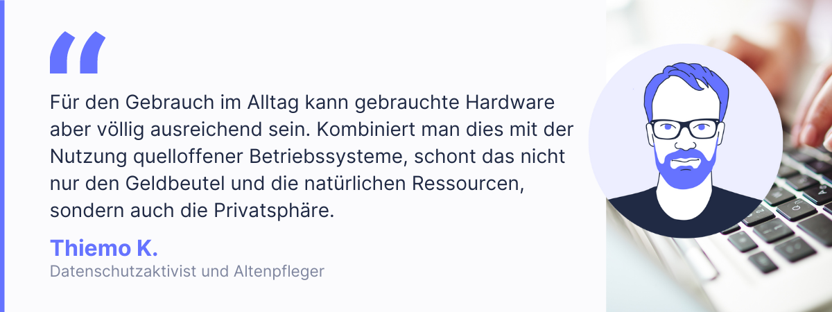 Natürlich gibt es auch Menschen, die z.B. in der IT-Branche arbeiten und auf moderne Technik angewiesen sind und ganz andere Anforderungen an die Geräte stellen. Für den Gebrauch im Alltag kann gebrauchte Hardware aber völlig ausreichend sein. Kombiniert man dies mit der Nutzung quelloffener Betriebssysteme, schont das nicht nur den Geldbeutel und die natürlichen Ressourcen, sondern auch die Privatsphäre.