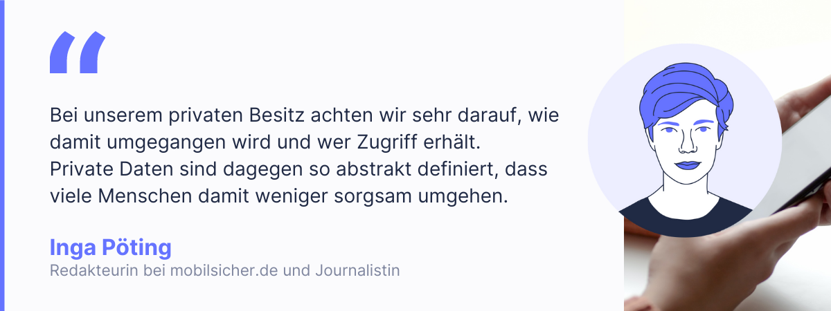Egal ob das sensible oder weniger sensible Daten sind: Ich setze das gerne mit privatem Besitz gleich. Wenn ich nicht zu Hause bin, möchte ich nicht, dass meine privaten Gegenstände entwendet werden oder an einen anderen Ort außerhalb meiner Wohnung gebracht werden. Bei unserem privaten Besitz achten wir sehr darauf, wie damit umgegangen wird und wer Zugriff erhält. Private Daten sind dagegen so abstrakt definiert, dass viele Menschen damit weniger sorgsam umgehen. Dieser Vergleich schafft meiner Meinung nach mehr Klarheit und Abhilfe.