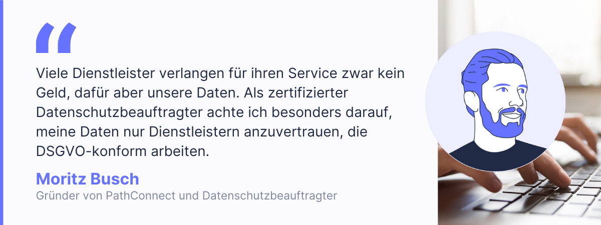 Moritz Busch ist zertifizierter Datenschutzbeauftragter und Gründer von PathConnect. Mit seinem Unternehmen möchte er die Themen Datenschutz und Privatsphäre speziell im Cloud-Bereich für mehr Menschen zugänglicher machen.
