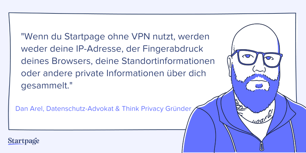 Deshalb gibt es Suchmaschinen wie Startpage, die keine dieser Informationen sammeln. Wenn du Startpage ohne VPN nutzt, werden weder deine IP-Adresse, der Fingerabdruck deines Browsers, deine Standortinformationen oder andere private Informationen über dich gesammelt.