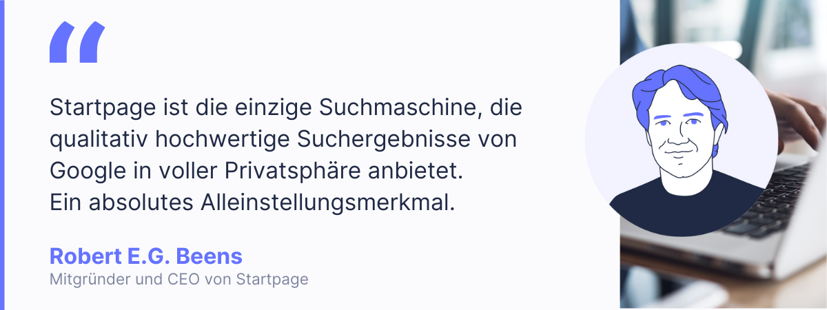 Unsere Gespräche über eine mögliche Partnerschaft mit Google begannen etwa ein Jahr, bevor wir 2006 die Vereinbarung schlossen. Wir haben uns für diese Partnerschaft entschieden, weil Google die beste Suchtechnologie anbietet und ihr technisches Team bereit war, sich wirklich ins Zeug zu legen, um die von uns benötigten Datenschutzbestimmungen zu ermöglichen. Diese einmalige Kombination ermöglicht es  Startpage, qualitativ hochwertige Suchergebnisse zu liefern, ohne Kompromisse bei der Privatsphäre einzugehen.