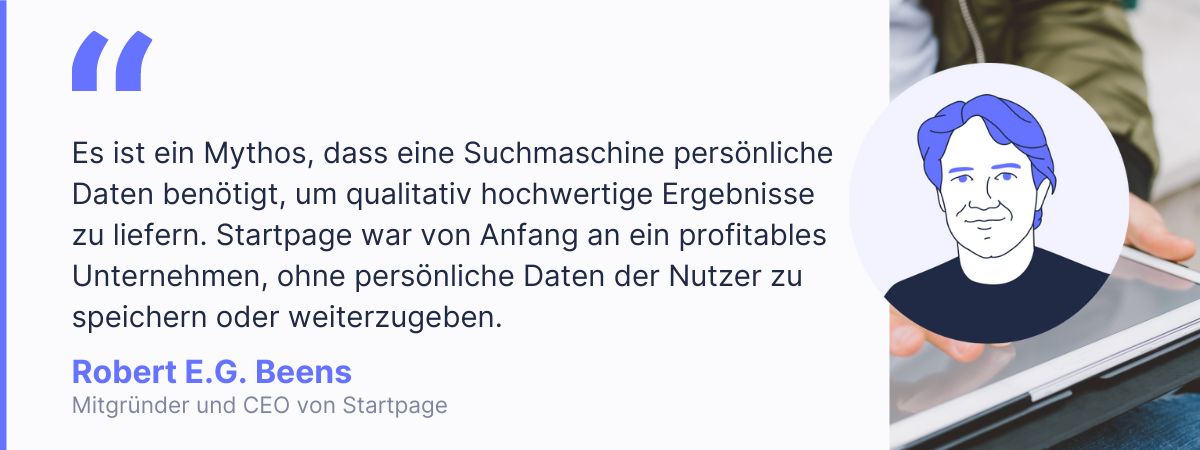 Es ist ein Mythos, dass eine Suchmaschine persönliche Daten benötigt, um qualitativ hochwertige Ergebnisse zu liefern. Startpage war von Anfang an ein profitables Unternehmen, ohne persönliche Daten der Nutzer zu speichern oder weiterzugeben. Wir verdienen durch kontextbezogene Anzeigen, die nur auf dem Suchbegriff basieren. Diese Einnahmen sind natürlich viel geringer als bei herkömmlichen Suchmaschinen, aber sie reichen aus, um die Kosten zu decken und weiter in unser Produkt zu investieren.