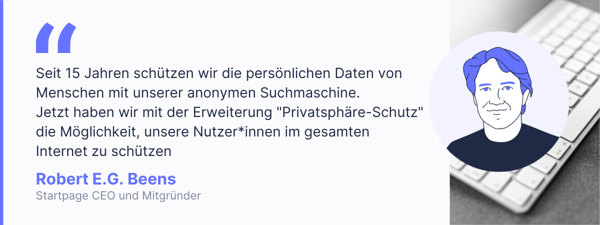 Robert E.G. Beens, CEO und Mitgründer von Startpage ergänzt: “Ich freue mich sehr darüber, wie sich unser Datenschutzangebot weiterentwickelt und auf neue Kanäle ausweitet. Seit 15 Jahren schützen wir die persönlichen Daten von Menschen mit Hilfe unserer anonymen Suchmaschine und unterstützen damit täglich Millionen von Menschen. Jetzt haben wir mit der Startpage Erweiterung ‘Privatsphäre-Schutz’ die Möglichkeit, unsere Nutzer*innen im gesamten Internet zu schützen”, so Robert E.G. Beens. “Ich bin sehr dankbar, ein so umfassendes Tool anbieten zu können, das den Menschen dabei hilft, ihr Recht auf Privatsphäre zu schützen und für die wunderbare Community, die um Startpage herum gewachsen ist.”