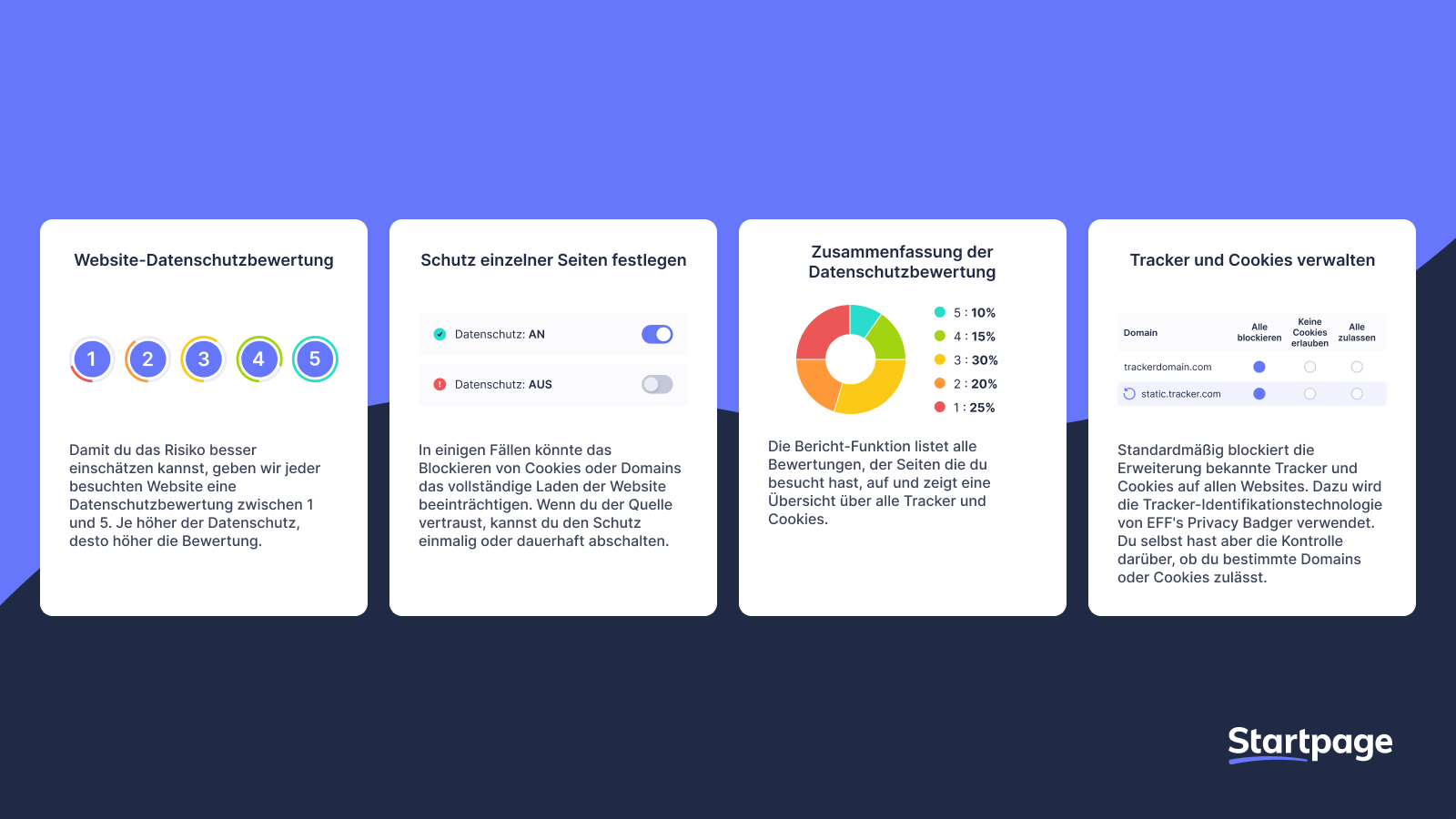 Die Browser-Erweiterung ist die wichtigste und umfangreichste Ergänzung der Startpage-Produktpalette seit der Einführung unserer “Anonymen Ansicht” im Jahr 2018. Sie ist kostenlos sowie einfach zu bedienen und bietet jeder*m Nutzer*in mehr Kontrolle über die eigene Privatsphäre im Netz.  Unser Team hat monatelang recherchiert und überlegt, wie eine einfache, schnell zu installierende Lösung für internetübergreifenden Schutz aussehen muss – und wir sind stolz auf das Ergebnis.