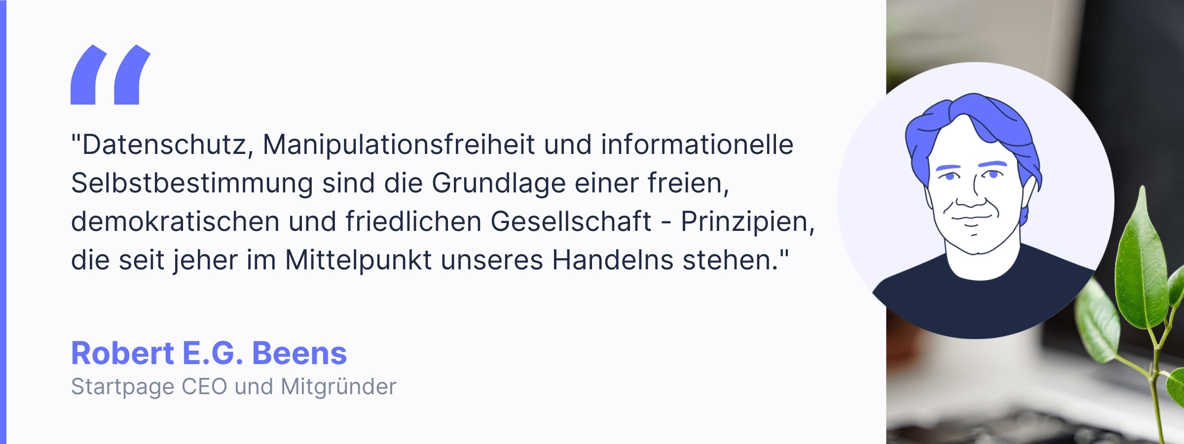 Wir bei Startpage möchten dazu beitragen, eine lebenswerte und nachhaltige Gesellschaft zu gestalten. Dies tun wir, indem wir das Recht auf Privatsphäre schützen und damit effektives sowie ressourcenschonendes Datenmanagement betreiben.