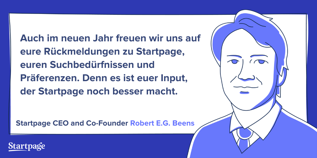 Auch im neuen Jahr freuen wir uns auf eure Rückmeldungen zu Startpage und euren individuellen Suchbedürfnissen und Präferenzen. Denn es ist euer Input, der Startpage noch besser macht. Teilt das Geschenk der Privatsphäre in diesem Jahr mit euren Liebsten und empfehlt Startpage weiter.