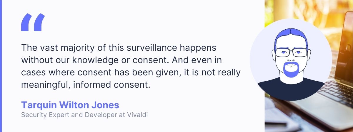Online, we tend to call these activities “tracking”, but this underplays what is at stake. The reality is that this is surveillance and profiling on a vast scale, to benefit corporations financially and competitively. The vast majority of this surveillance happens without our knowledge or consent. And even in cases where consent has been given, it is not really meaningful, informed consent. It is just a hurried click on “accept”, hoping to make a website or service work with minimal effort.
