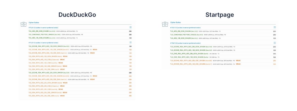 Where you see Startpage has a stronger TLS 1.2 suite.