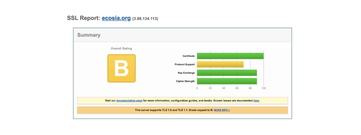 And then Ecosia, who we compared to Startpage here came in with a B rating, with no support for TLS 1.3 and multiple weaknesses in their 1.2, 1.1, and 1.0 protocols.