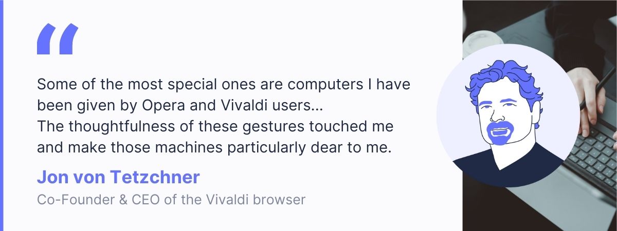 Jon von Tetzchner is the Co-Founder & CEO of the Vivaldi browser. He has been into browser development since 1994. He and his team are building Vivaldi that puts users’ privacy and their needs first. When he is not testing Vivaldi or reading Vivaldi forums, he enjoys collecting and playing with vintage computers and arcade games.