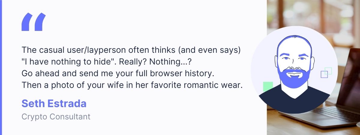 Seth Estrada: The casual user/layperson often thinks (and even says) “I have nothing to hide”. Really? Nothing…? Go ahead and send me your full browser history. Then a photo of your wife in her favorite romantic wear. Finally, the login credentials to your bank account. The reality is *everyone* who has pondered long enough will eventually think of things they can and probably should hide.