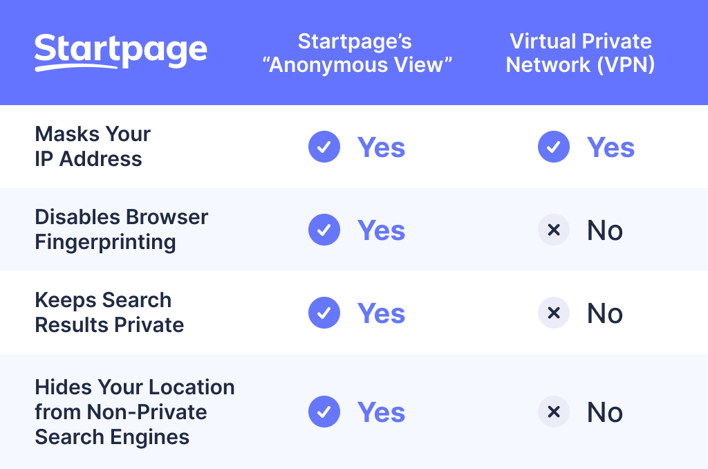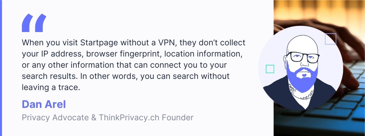 On the other side are private search engines such as Startpage. When you visit Startpage without a VPN, they don’t collect your IP address, browser fingerprint, location information, or any other information that can connect you to your search results. In other words, you can search without leaving a trace.