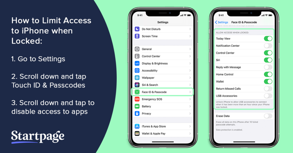 Even if you enable a passcode, intruders can still gain access to certain functions and features on your phone – including your messages, control center, and digital wallet. Disable “allow access when locked” for:
