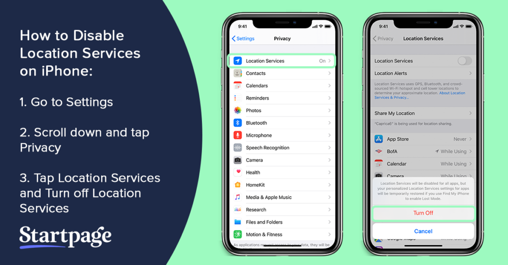 How to Disable Location Services: Settings > Privacy > Location Services > Share My Location