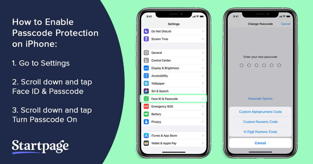 How to Enable Passcode: Settings > Face ID & Passcode > Turn On Passcode > Passcode Options