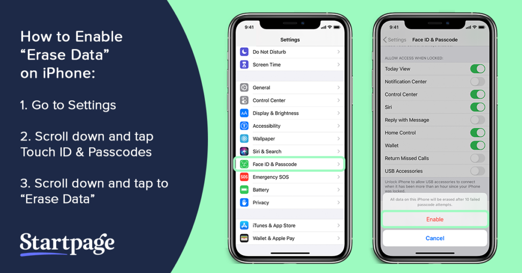 How to Enable Erase Data: Settings > Touch ID & Passcode > Erase Data