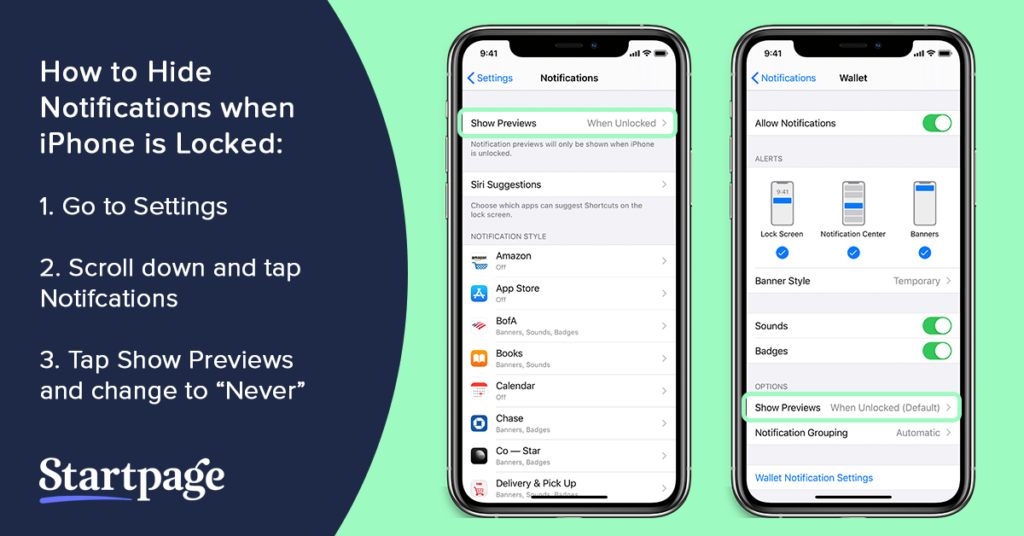 How to hide notification previews when locked: Settings > Notifications > App > Show Previews