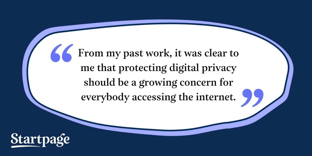 Kim: Computers fascinated me from a very early age. I worked in consumer remote tech support in my 20s, and I remember how many incidents I dealt with that were related to malware. I started learning as much about malware as I could, because I was intrigued. Malware, such as spyware and remote access trojans, are a frequent privacy threat! I’ve made a career out of researching and writing about cybersecurity, and keeping active on Twitter. Now I get to share my interests with Startpage.