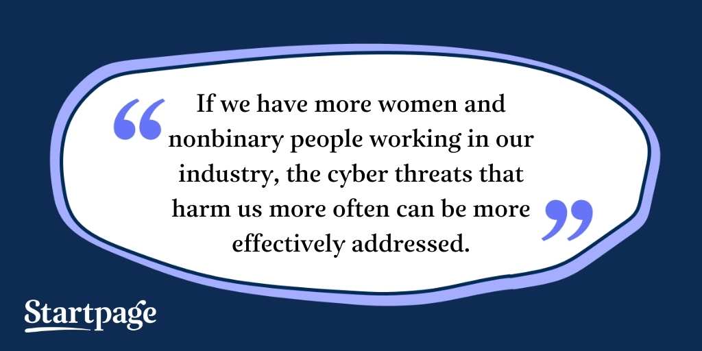 Kim: As women and nonbinary people, we should be extra vigilant about our online privacy. We’re frequent cyber stalking targets! As much as we should be concerned about stalkerware and other forms of spyware, we should also want to avoid having Big Tech track us online. Making Startpage our default search engine in our web browsers is a simple way for us to take some control back. Lots of women work at Startpage! I think the general public would be pleasantly surprised by that.
