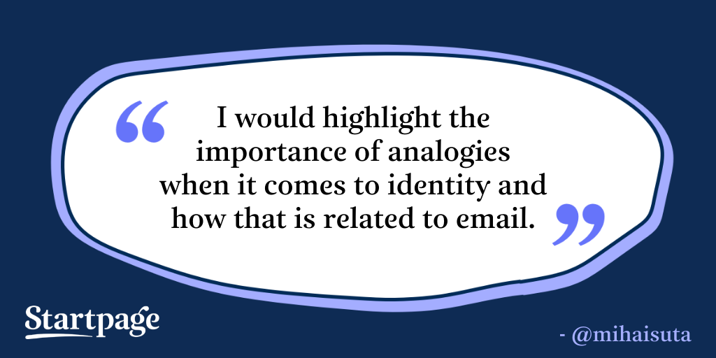 “I would highlight the importance of analogies when it comes to identity and how that is related to email. After this point, it becomes easier to go further to data privacy.” – @mihaisuta