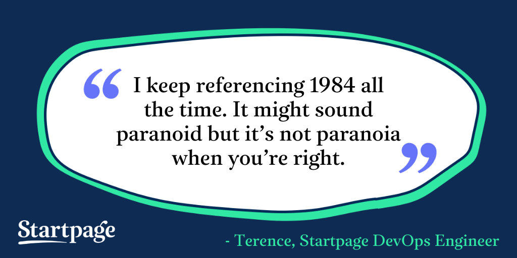 3. Sit back and watch them panic. More seriously, I keep referencing 1984 all the time. It might sound paranoid but it’s not paranoia when you’re right.” – Terence, Startpage DevOps Engineer