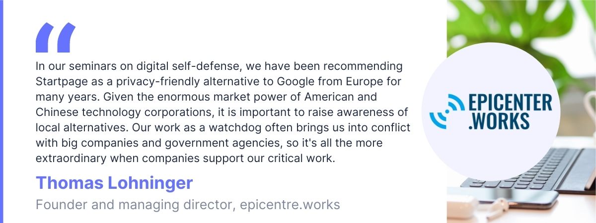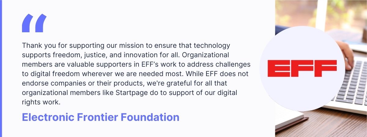 Startpage’s number one mission is to protect the privacy of our users. That is why we support a number of global organizations that are committed to data protection and the right to privacy.