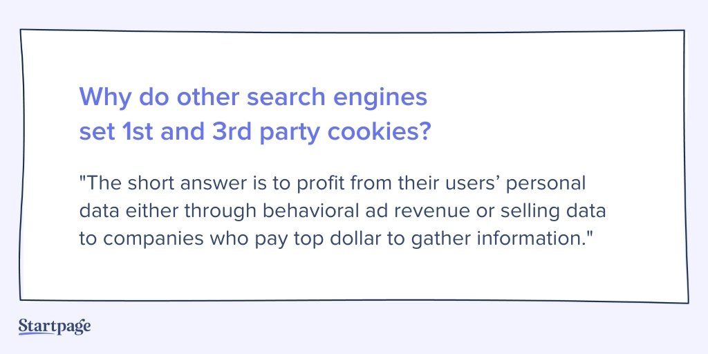 So… why do other search engines set 1st and 3rd party cookies on people? The short answer is to profit from their users’ personal data either through behavioral ad revenue or selling data to companies who pay top dollar to gather information. For more context, which is always helpful, below is a brief list of reasons why other search engines track people: